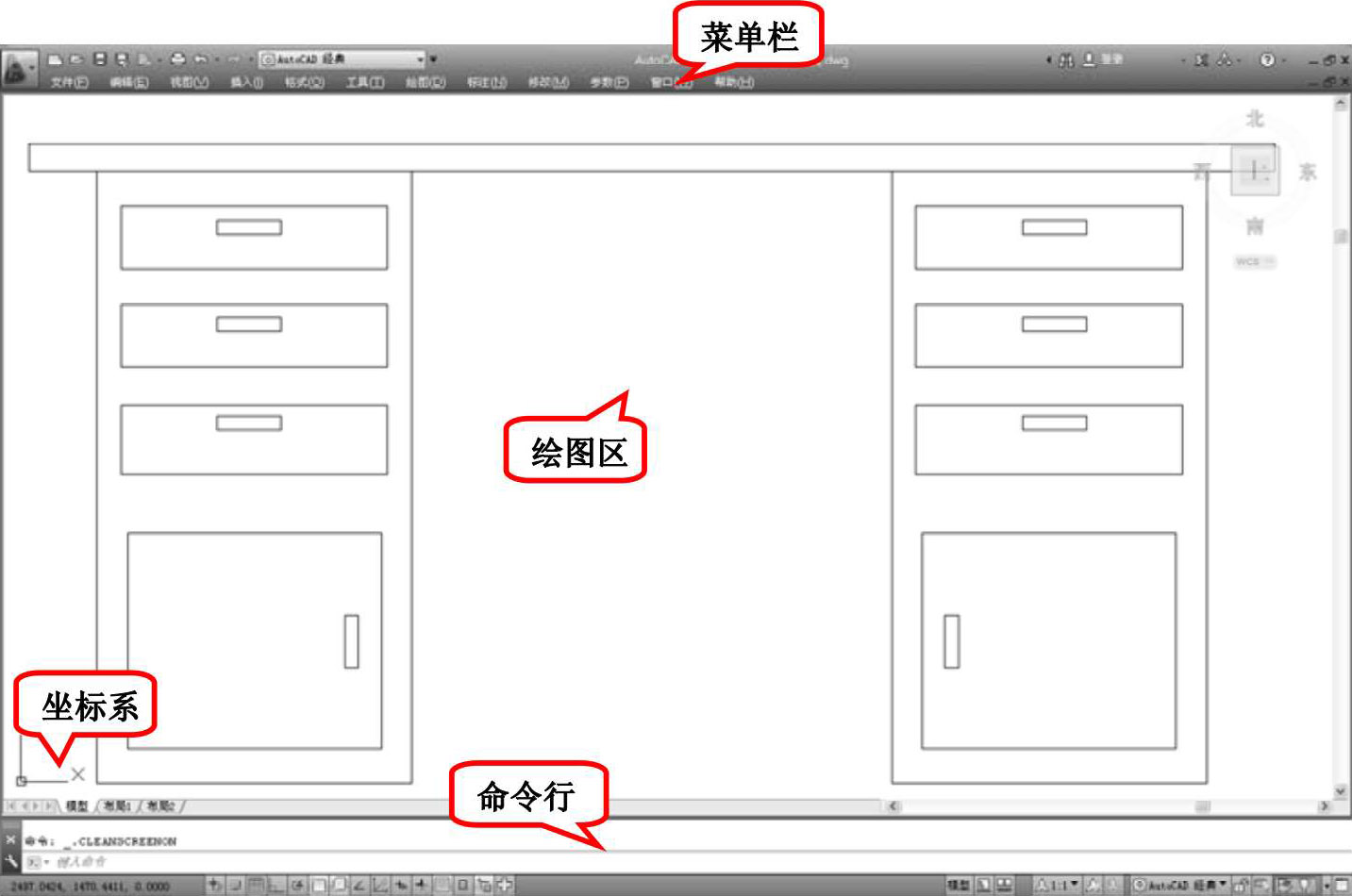 需要将AutoCAD的工作空间切换到“AutoCAD经典”模式下(单击操作界面右下角的“切换工作空间”按钮,在弹出的下拉列表中选择“AutoCAD经典”命令),才能显示如图2-1所示的操作界面。本书中所有操作均在“AutoCAD经典”模式下进行。