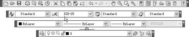 在AutoCAD经典模式的默认情况下,可以看到操作界面顶部的“标准”工具栏、“样式”工具栏、“特性”工具栏及“图层”工具栏(如图2-5所示)和位于绘图区左侧的“绘图”工具栏、右侧的“修改”工具栏及“绘图次序”工具栏(如图2-6所示)。