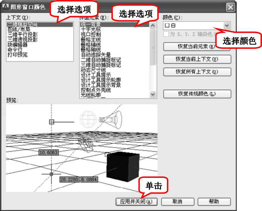 (1)选择菜单栏中的“工具”→“选项”命令,打开“选项”对话框,单击如图2-20所示的“显示”选项卡,再单击“窗口元素”选项组中的“颜色”按钮,打开如图2-21所示的“图形窗口颜色”对话框。