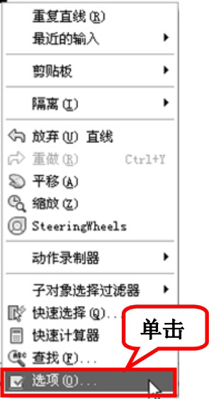 ●快捷菜单:在绘图区右击,在弹出的快捷菜单中选择“选项”命令,如图2-18所示。