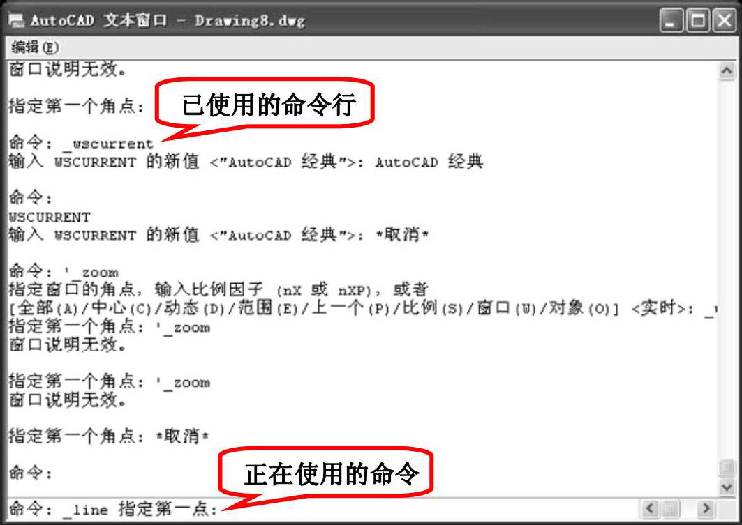 (3)对当前命令行窗口中输入的内容,可以按<F2>键用文本编辑的方法进行编辑,如图2-11所示。AutoCAD文本窗口和命令行窗口相似,可以显示当前AutoCAD进程中命令的输入和执行过程。在执行AutoCAD某些命令时,会自动切换到文本窗口,列出有关信息。