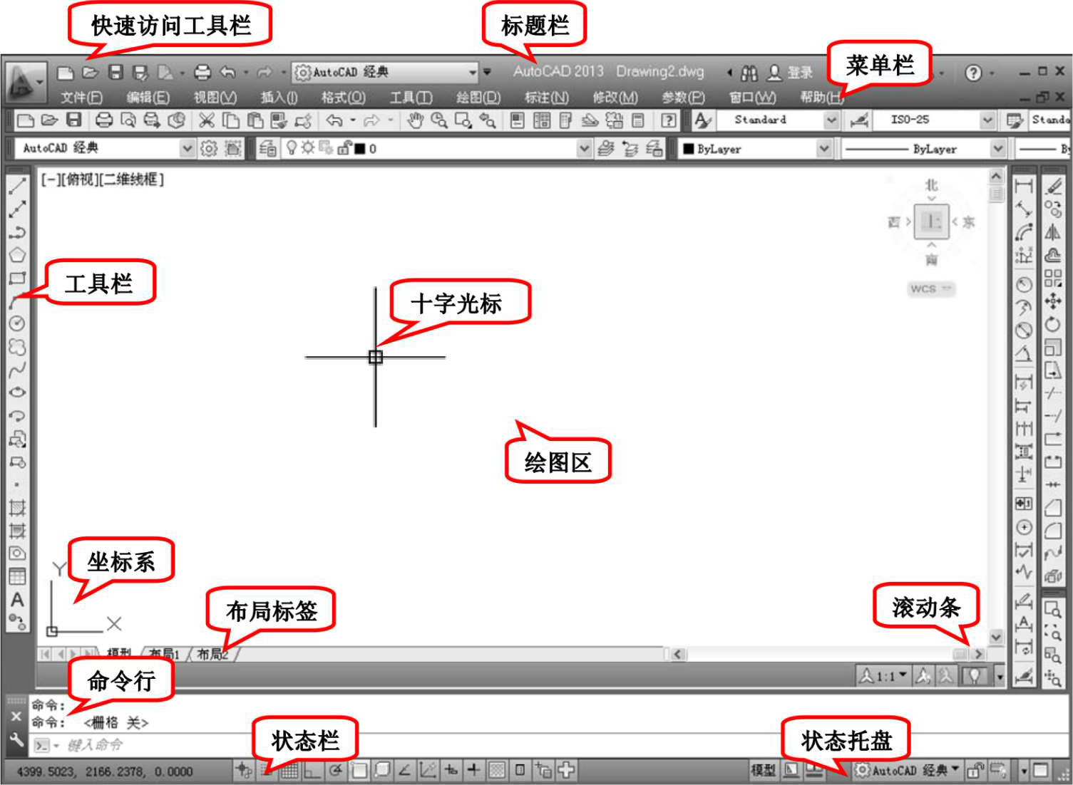 AutoCAD操作界面是AutoCAD显示、编辑图形的区域,一个完整的AutoCAD操作界面如图2-1所示,包括标题栏、菜单栏、工具栏、快速访问工具栏、绘图区、坐标系、命令行、状态栏、布局标签、滚动条、状态托盘。