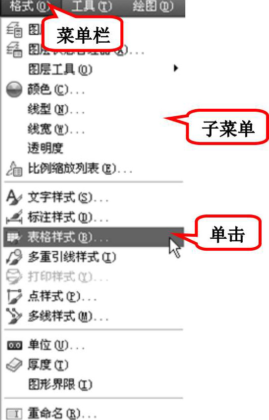 (2)打开对话框的菜单命令。这种类型的菜单命令后面带有省略号。例如,选择菜单栏中的“格式”→“表格样式”命令,如图2-3所示,系统就会打开“表格样式”对话框,如图2-4所示。