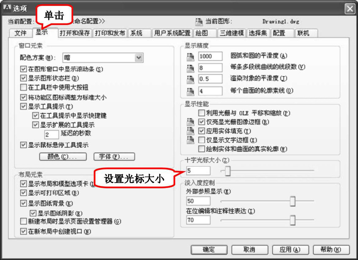 (2)单击“显示”选项卡,在“十字光标大小”文本框中直接输入数值,或拖动文本框后面的滑块,也可以对十字光标的大小进行调整,如图2-16所示。