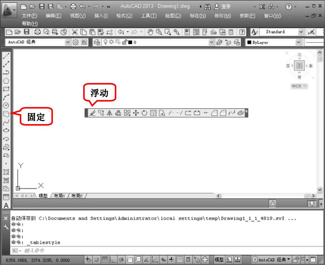 (2)工具栏的“固定”、“浮动”与“打开”。工具栏可以在绘图区“浮动”显示(如图2-8所示),此时显示该工具栏的标题,并可关闭该工具栏,可以拖动“浮动”工具栏到绘图区边界,使它变为“固定”工具栏,此时该工具栏标题隐藏。也可以把“固定”工具栏拖出,使它成为“浮动”工具栏。