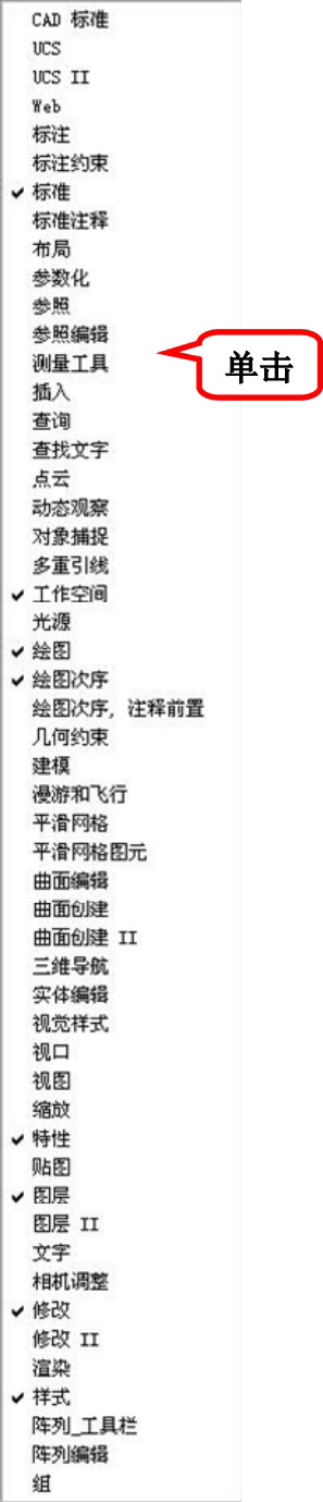 (1)设置工具栏。AutoCAD 2013提供了52种工具栏,将光标移到操作界面上方的工具栏区并右击,系统会自动打开单独的工具栏标签,如图2-7所示。单击某一个未在界面显示的工具栏名,系统自动在界面打开该工具栏;反之,关闭该工具栏。