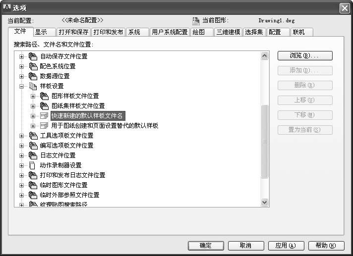 ❷选择菜单栏中的“工具”→“选项”命令,在“选项”对话框中选择默认图形样板文件。具体方法是:在“文件”选项卡中,单击“样板设置”前面的“+”号,在展开的选项列表中选择“快速新建的默认样板文件名”选项,如图1-24所示。单击“浏览”按钮,打开“选择文件”对话框,然后选择所需要的样板文件即可。