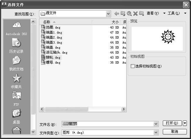 执行上述命令后,打开“选择文件”对话框,如图1-25所示,在“文件类型”下拉列表框中用户可选.dwg文件、.dwt文件、.dxf文件和.dws文件。其中,.dws文件是包含标准图层、标注样式、线型和文字样式的样板文件;.dxf文件是用文本形式存储的图形文件,能够被其他程序读取,许多第三方应用软件都支持.dxf格式。