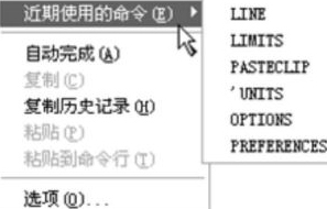 (5)在命令行打开快捷菜单。如果在前面刚使用过要输入的命令,则可以在命令行右击,打开快捷菜单,在“近期使用的命令”子菜单中选择所需要的命令,如图1-35所示。“近期使用的命令”子菜单中储存了最近使用的6个命令,如果经常重复使用某6个命令以内的命令,这种方法就比较快速简捷。