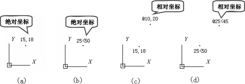 在命令行输入点的坐标“15, 18”,则表示输入了一个X、Y的坐标值分别为15、18的点,此为绝对坐标输入方式,表示该点的坐标是相对于当前坐标原点的坐标值,如图1-37(a)所示。如果输入“@10,20”,则为相对坐标输入方式,表示该点的坐标是相对于前一点的坐标值,如图1-37(c)所示。