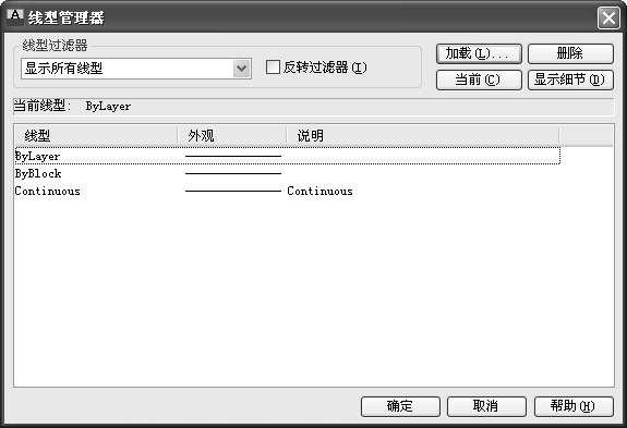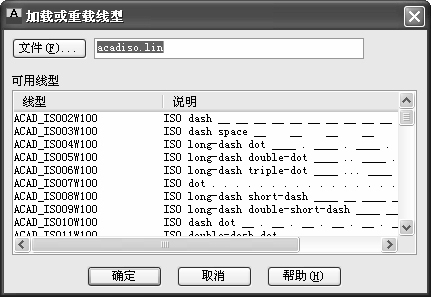 (1)“已加载的线型”列表框:显示在当前绘图中加载的线型,可供用户选用,其右侧显示线型的型式。