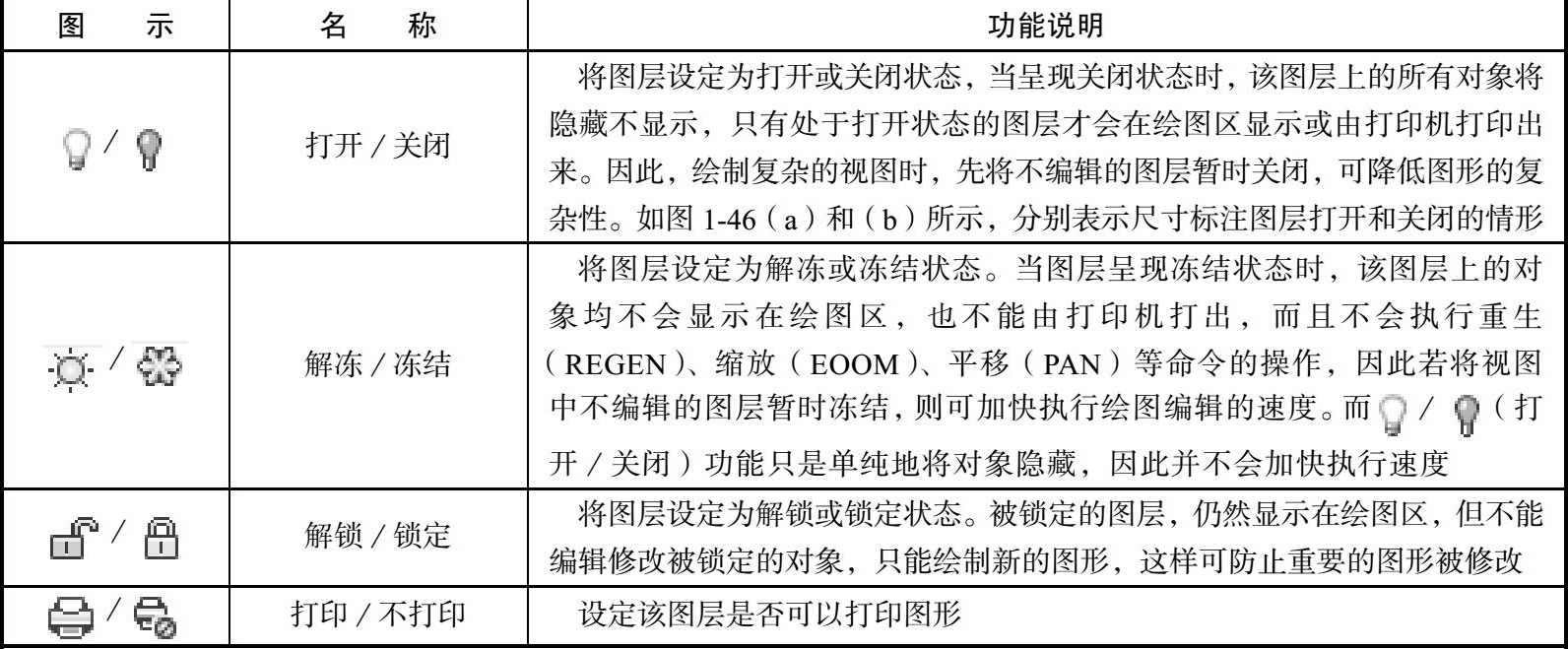 ③ 状态转换图标:在“图层特性管理器”对话框的图层列表中有一列图标,单击这些图标,可以打开或关闭该图标所代表的功能。各图标功能说明如表1-1所示。