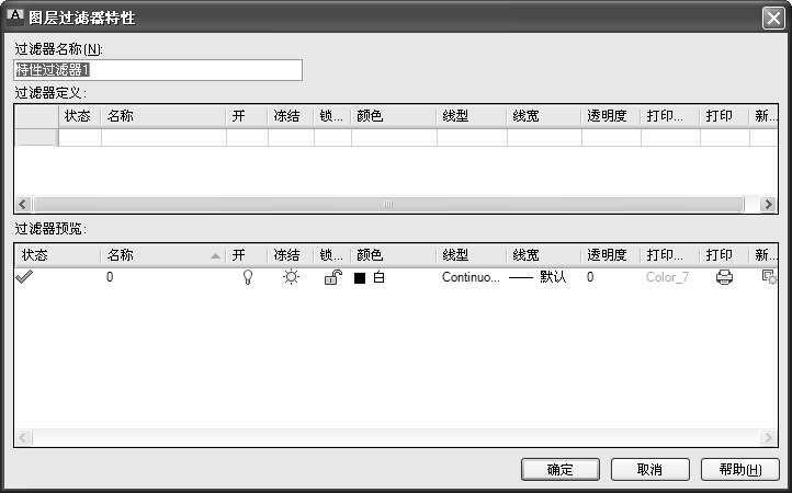 (1)“新建特性过滤器”按钮 :单击该按钮,可以打开“图层过滤器特性”对话框,如图1-44所示,从中可以基于一个或多个图层特性创建图层过滤器。