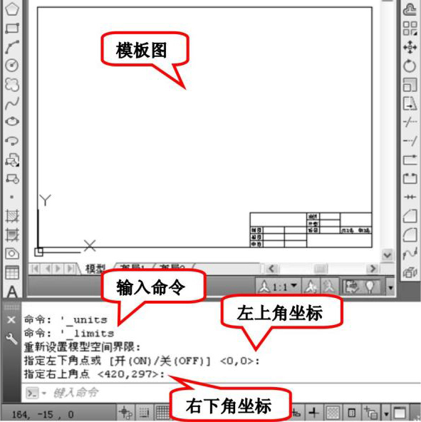 在这里,不妨按国标A3图纸的幅面设置图形边界。A3图纸的幅面为420mm×297mm,设置图形边界过程如图1-58所示。