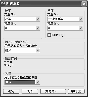 设置单位。选择菜单栏中的“格式” →“单位”命令,AutoCAD打开“图形单位”对话框,如图1-57所示。设置“长度”的类型为“小数”,“精度”为0;“角度”的类型为“十进制度数”,“精度”为0,系统默认逆时针方向为正,“插入时的缩放单位”设置为“毫米”。