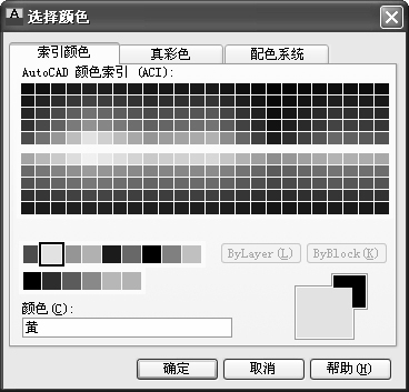 (2)设置图层颜色。为了区分不同的图层上的图线,增加图形不同部分的对比性,可以为不同的图层设置不同的颜色。单击刚建立的CEN图层“颜色”标签下的颜色色块,AutoCAD打开“选择颜色”对话框,如图1-62所示。在该对话框中选择黄色,单击“确定”按钮。在图层特性管理器中可以发现CEN图层的颜色变成了黄色,如图1-63所示。