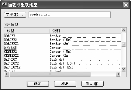 (3)设置线型。在常用的工程图纸中,通常要用到不同的线型,这是因为不同的线型表示不同的含义。在图层特性管理器中单击CEN图层“线型”标签下的线型选项,AutoCAD打开“选择线型”对话框,如图1-64所示。单击“加载”按钮,打开“加载或重载线型”对话框,如图1-65所示。在该对话框中选择CENTER线型,单击“确定”按钮,如图1-66所示。系统回到“选择线型”对话框,这时在“已加载的线型”列表框中就出现了CENTER线型。选择CENTER线型,单击“确定”按钮,在图层特性管理器中可以发现CEN图层的线型变成了CENTER线型,如图1-67所示。