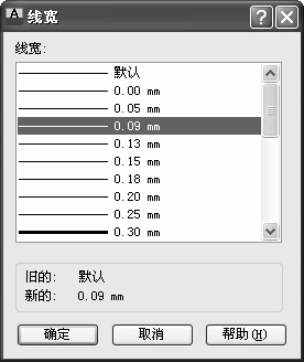 (4)设置线宽。在工程图纸中,不同的线宽也表示不同的含义,因此也要对不同的图层的线宽进行设置。单击图层特性管理器中CEN图层“线宽”标签下的选项,AutoCAD打开“线宽”对话框,如图1-68所示。在该对话框中选择适当的线宽,单击“确定”按钮,在图层特性管理器中可以发现CEN图层的线宽变成了0.09mm,如图1-69所示。
