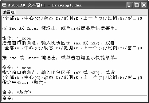(3)对当前命令行窗口中输入的内容,可以按<F2>键用文本编辑的方法进行编辑,如图1-11所示。AutoCAD文本窗口和命令行窗口相似,可以显示当前AutoCAD进程中命令的输入和执行过程。在执行AutoCAD某些命令时,会自动切换到文本窗口,列出有关信息。