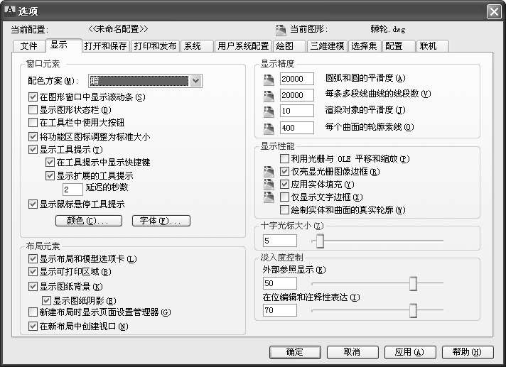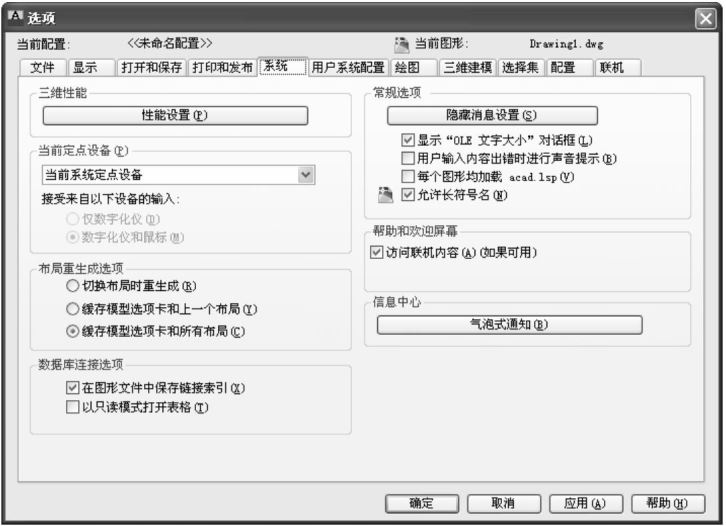 执行上述命令后,系统打开“选项”对话框,用户可以在该对话框中设置有关选项,对绘图系统进行配置。下面就其中主要的两个选项卡进行说明,其他配置选项在后面用到时再进行具体说明。