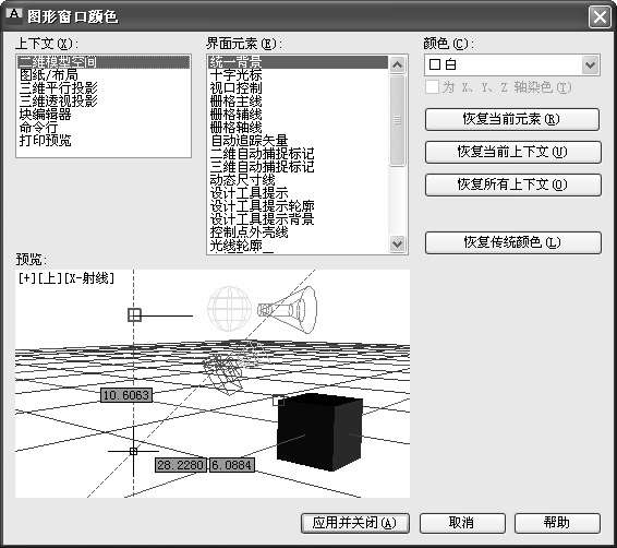 在“图形窗口颜色”对话框中选取界面元素,在“颜色”下拉列表框中,选择所需要的窗口颜色,然后单击“应用并关闭”按钮,此时AutoCAD的绘图区就变换了背景色,通常按视觉习惯选择白色为窗口颜色。 7NyziB6J34yOMa9DZcDyqgo2KgG7I64hGIVjHS4K0GwtKbXGkKmFROuftMkHRnFq