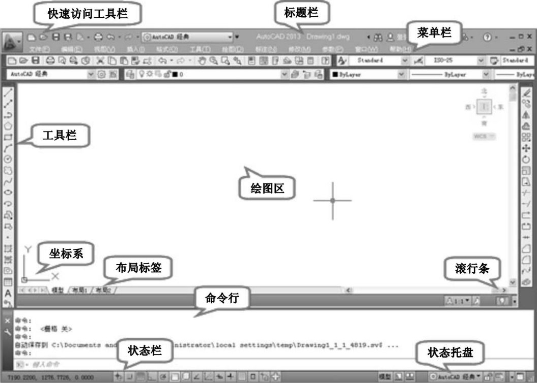 AutoCAD操作界面是AutoCAD显示、编辑图形的区域,一个完整的AutoCAD操作界面如图1-1所示,包括标题栏、菜单栏、工具栏、快速访问工具栏、交互信息工具栏、绘图区、十字光标、坐标系图标、命令行窗口、状态栏、布局标签、滚动条、状态托盘等。