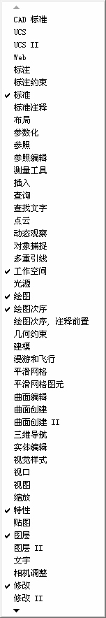 (1)设置工具栏。AutoCAD 2013提供了52种工具栏,将光标放在操作界面上方的工具栏区右击,系统会自动打开单独的工具栏标签,如图1-7所示。单击某一个未在界面上显示的工具栏名,系统自动在界面上打开该工具栏;反之,关闭工具栏。