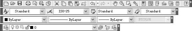 工具栏是一组按钮工具的集合,把光标移动到某个按钮上,稍停片刻即在该按钮的一侧显示相应的功能提示,同时在状态栏中显示对应的说明和命令名,此时,单击按钮就可以启动相应的命令了。在AutoCAD经典模式的默认情况下,可以看到操作界面顶部的“标准”工具栏、“样式”工具栏、“特性”工具栏以及“图层”工具栏(如图1-5所示)和位于绘图区左侧的“绘图”工具栏、右侧的“修改”工具栏和“绘图次序”工具栏(如图1-6所示)。