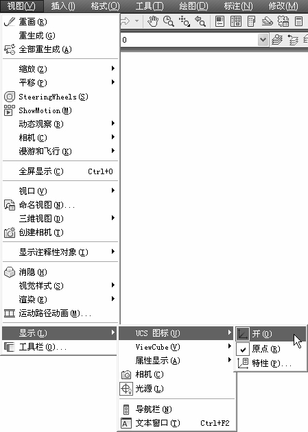 在绘图区的左下角有一个箭头指向的图标,称为坐标系图标,表示用户绘图时正使用的坐标系样式。坐标系图标的作用是为点的坐标确定一个参照系。根据工作需要,用户可以选择将其关闭,其方法是选择菜单栏中的“视图”→“显示”→“UCS图标”→“开”命令,如图1-10所示。