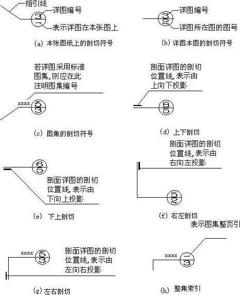 室内平、立、剖面图中,在需要另设详图表示的部位标注一个索引符号,以表明该详图的位置,这个索引符号就是详图索引符号。详图索引符号采用细实线绘制,圆圈直径为10mm。如图1-16所示,图中(d)、(e)、(f)、(g)用于索引剖面详图,当详图就位于本张图样中时,采用图1-16(a)的形式,详图不在本张图样中时,采用如图1-16(b)~图1-16(g)所示的形式。