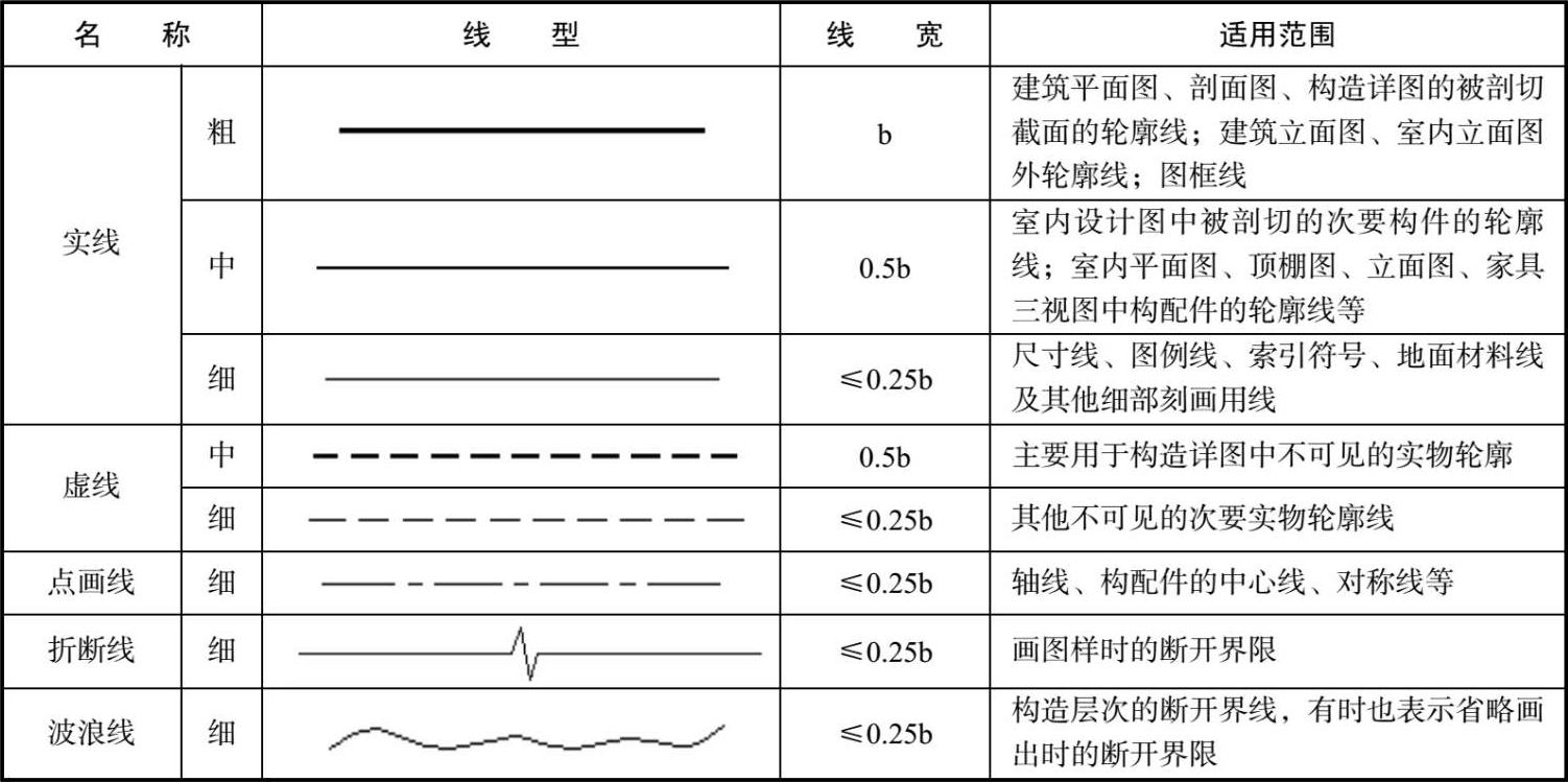 室内设计图主要由各种线条构成,不同的线型表示不同的对象和不同的部位,代表着不同的含义。为了使图面能够清晰、准确、美观地表达设计思想,工程实践中采用了一套常用的线型,并规定了它们的使用范围,常用线型如表1-2所示。在AutoCAD 2013中,可以通过“图层”中“线型”、“线宽”的设置来选定所需线型。