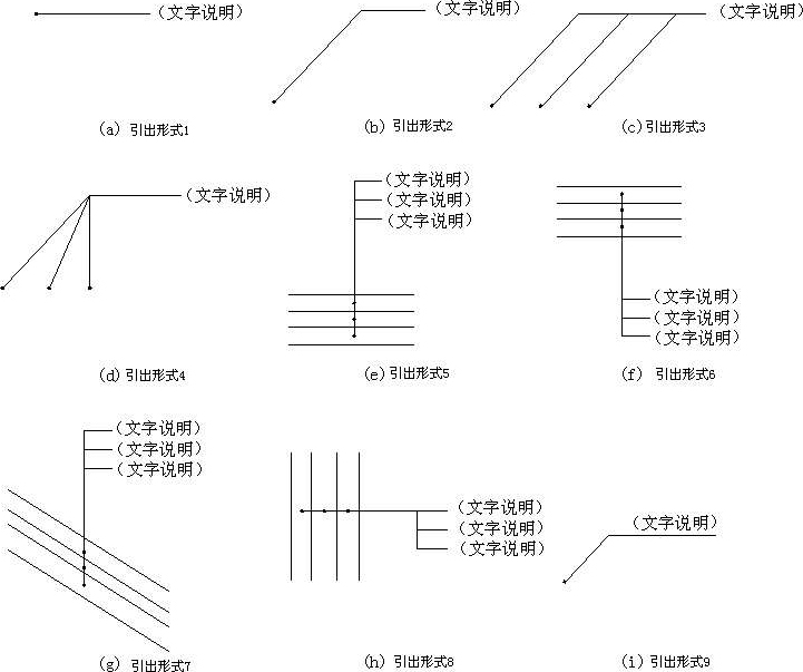 由图样引出一条或多条线段指向文字说明,该线段就是引出线。引出线与水平方向的夹角一般采用0°、30°、45°、60°、90°,常见的引出线形式如图1-18所示。图1-18(a)~图1-18(d)为普通引出线,图1-18(e)~图1-18(h)为多层构造引出线。使用多层构造引出线时,应注意构造分层的顺序要与文字说明的分层顺序一致。文字说明可以放在引出线的端头,如图1-18(a)~图1-18(h)所示,也可放在引出线水平段之上,如图1-18(i)所示。