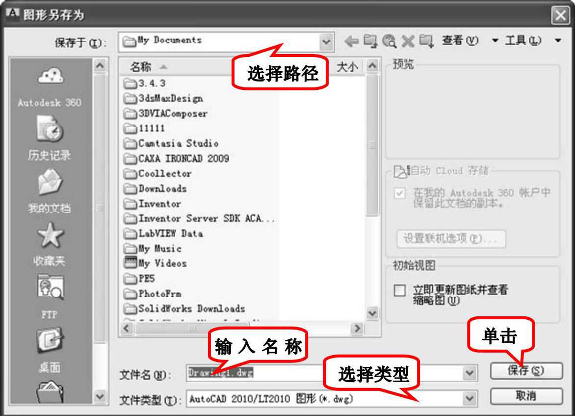 执行上述命令后,若文件已命名,则系统自动保存文件;若文件未命名(即为默认名drawing1.dwg),则系统打开“图形另存为”对话框,如图2-25所示,用户可以重新命名并保存。在“保存于”下拉列表框中指定保存文件的路径,在“文件类型”下拉列表框中指定保存文件的类型。