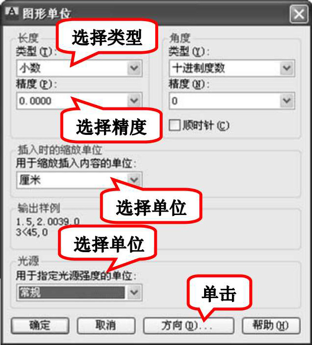 ● “输出样例”选项组:显示用当前单位和角度设置的例子。