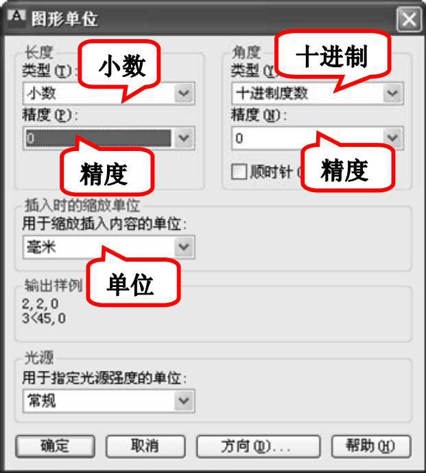 (2)设置单位。选择菜单栏中的“格式”→“单位”命令,AutoCAD打开“图形单位”对话框,如图2-39所示。设置“长度”的类型为“小数”,“精度”为0;“角度”的类型为“十进制度数”,“精度”为0。系统默认逆时针方向为正,“插入时的缩放单位”设置为“毫米”。