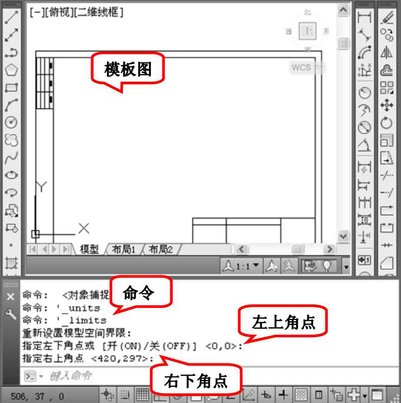 选择菜单栏中的“格式”→“图形界限”命令,设置图幅,命令操作如图2-40所示。
