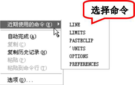 (5)在命令行打开快捷菜单。如果在前面刚使用过要输入的命令,可以在命令行右击鼠标,打开快捷菜单,在“近期使用的命令”子菜单中选择需要的命令,如图2-31所示。“近期使用的命令”子菜单中储存最近使用的6个命令,如果经常重复使用某6个命令以内的命令,这种方法就比较快速简洁。