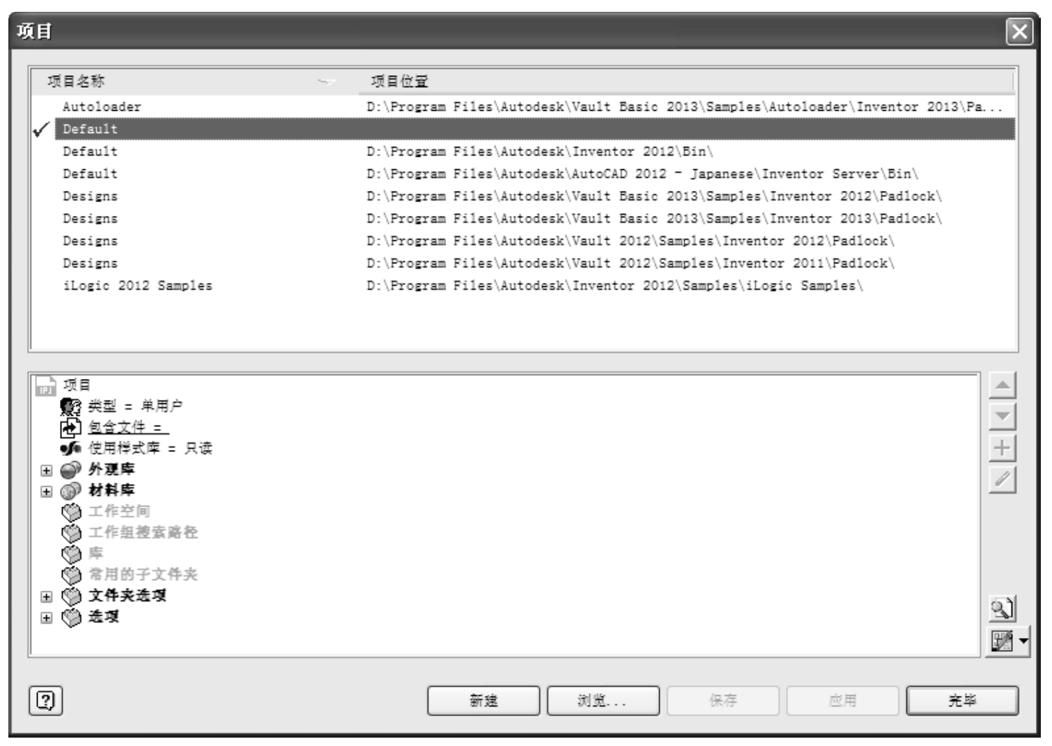 (8)新建:单击此按钮,打开如图2-5(a)所示“Inventor项目向导”对话框1,单击“下一步”按钮,打开如图2-5(b)所示“Inventor项目向导”对话框2,选定项目路径将成为新项目的默认设置。