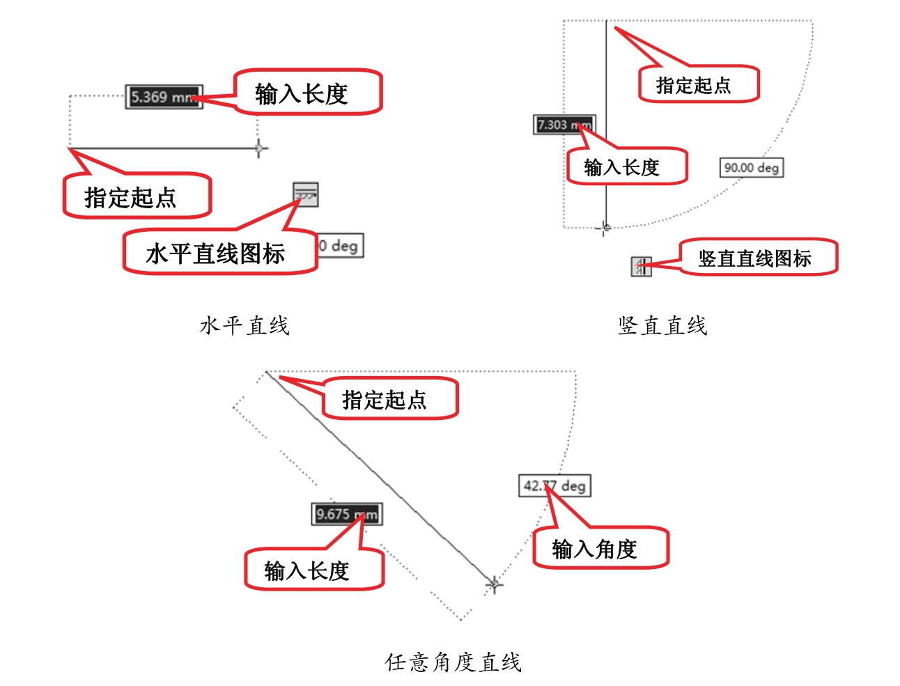 直线分为三种类型:水平直线、竖直直线和任意角度直线,操作过程如图3-5所示。