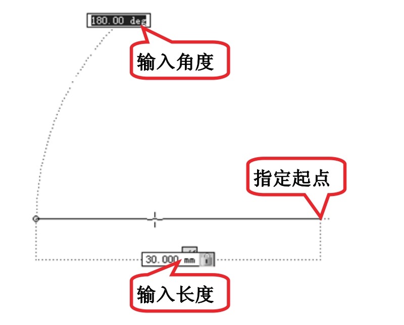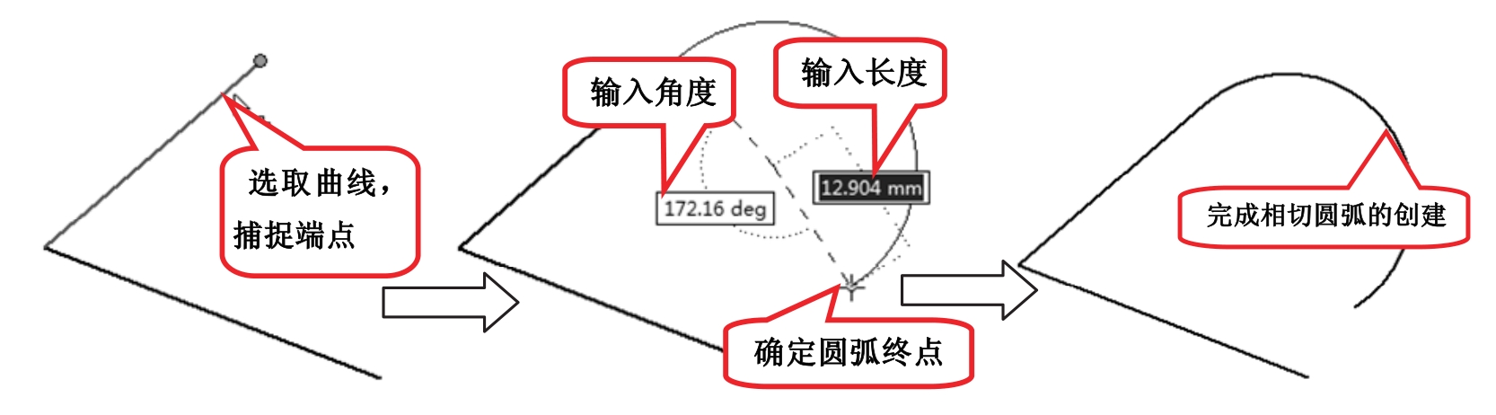 直线命令还可创建与几何图元相切或垂直的圆弧,如图3-6所示,首先移动鼠标到直线的一个端点,然后按住鼠标左键,在要创建圆弧的方向上拖动鼠标,即可创建圆弧。