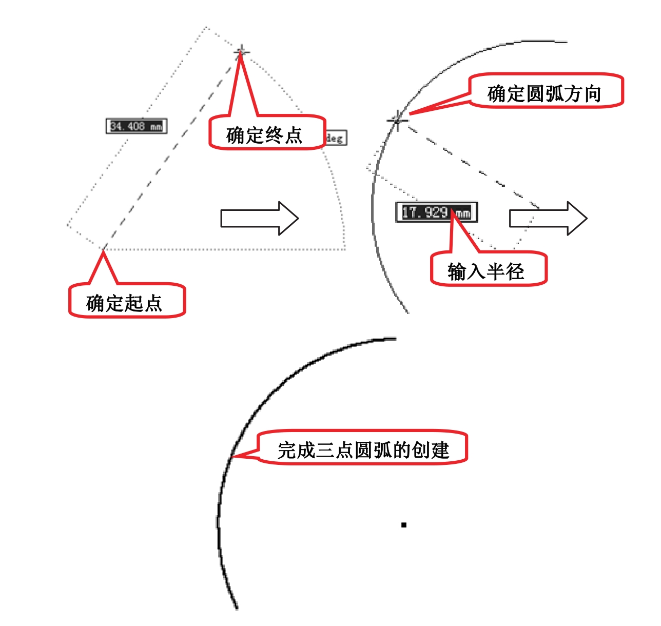 圆弧可以通过三种方式来绘制:第一种是通过三点绘制圆弧,即三点圆弧;第二种是通过圆心半径来确定圆弧,即圆心圆弧;第三种是绘制基于周边的圆弧,即相切圆弧。