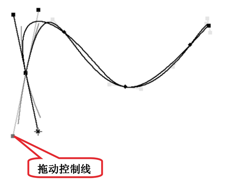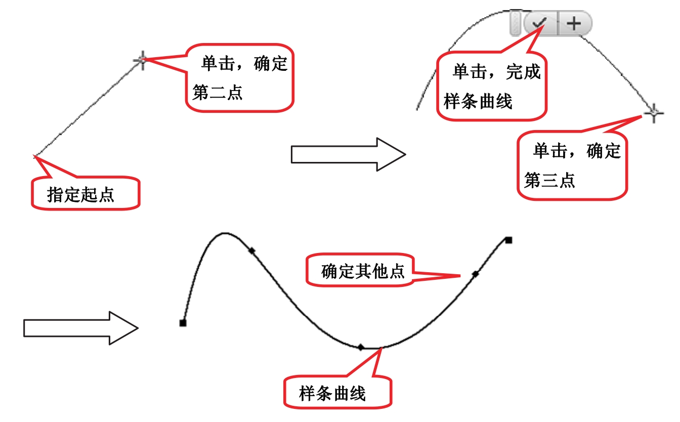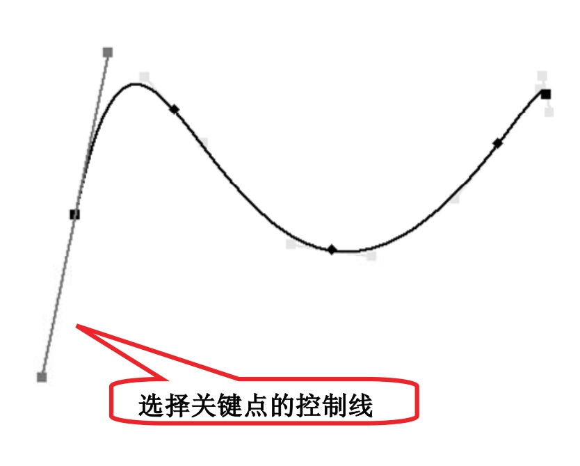 当要改变样条曲线的形状时,选择关键点的控制线,如图3-8所示,拖动控制线调节样条曲线的形状,如图3-9所示,单击完成样条曲线的更改。