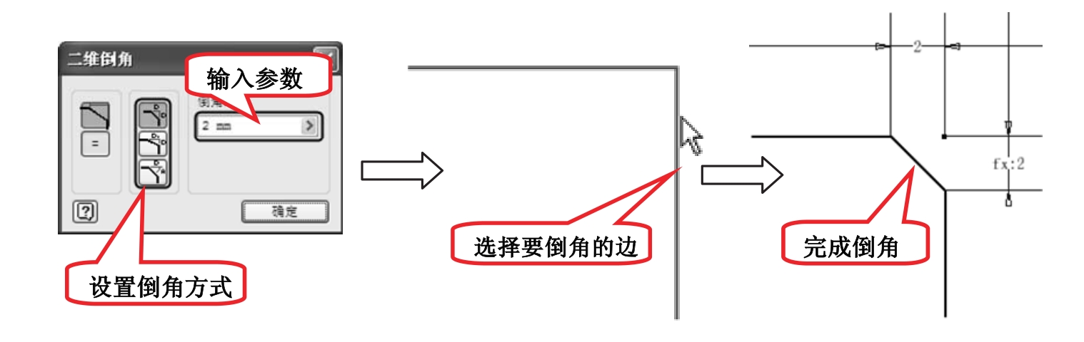 功能区:单击“草图”标签栏“绘制”面板上的“倒角”按钮