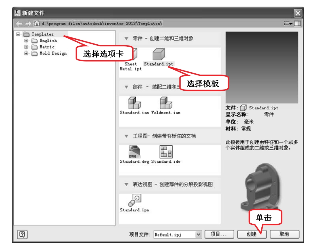 ,在打开的如图3-25所示的“新建文件”对话框中的“Templates”选项卡中的零件下拉列表中选择“Standard.ipt”选项,单击“创建”按钮,新建一个零件文件。