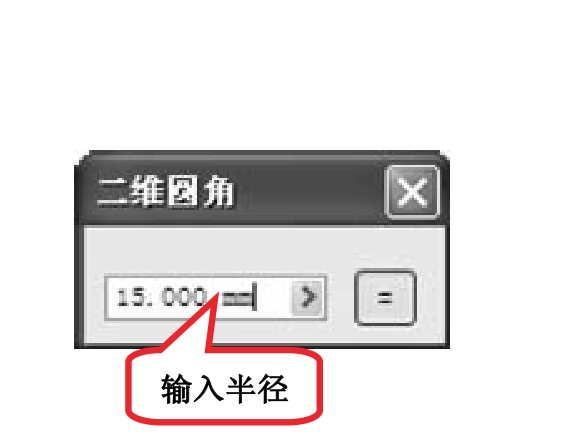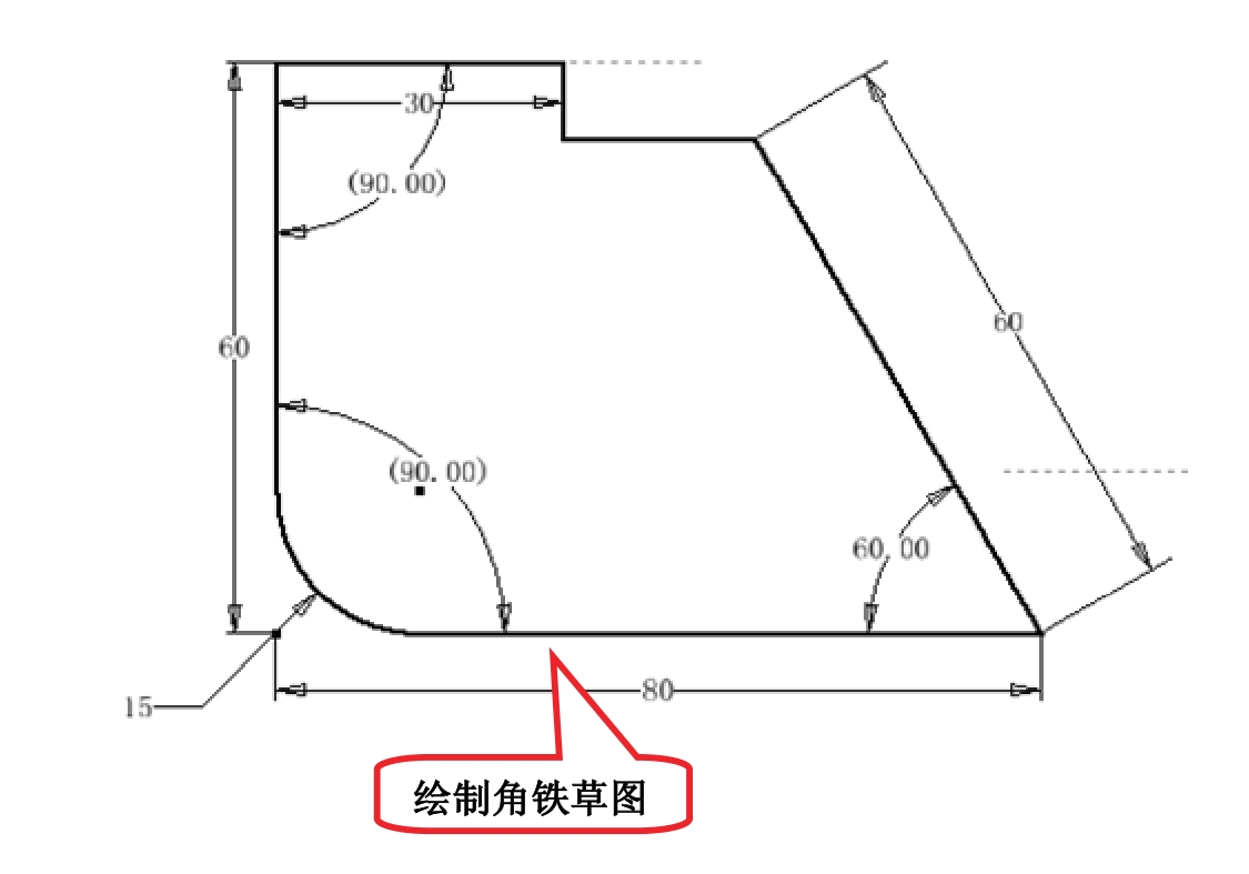 ,打开如图3-29所示的“二维圆角”对话框,输入半径为15,选择如图3-30所示的两条线,单击完成角铁草图的绘制,如图3-24所示。