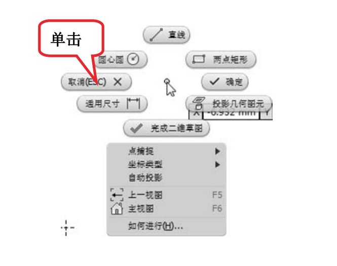 ❷ 进入草图环境。单击“三维模型”标签栏“草图”面板上的“创建二维草图”按钮