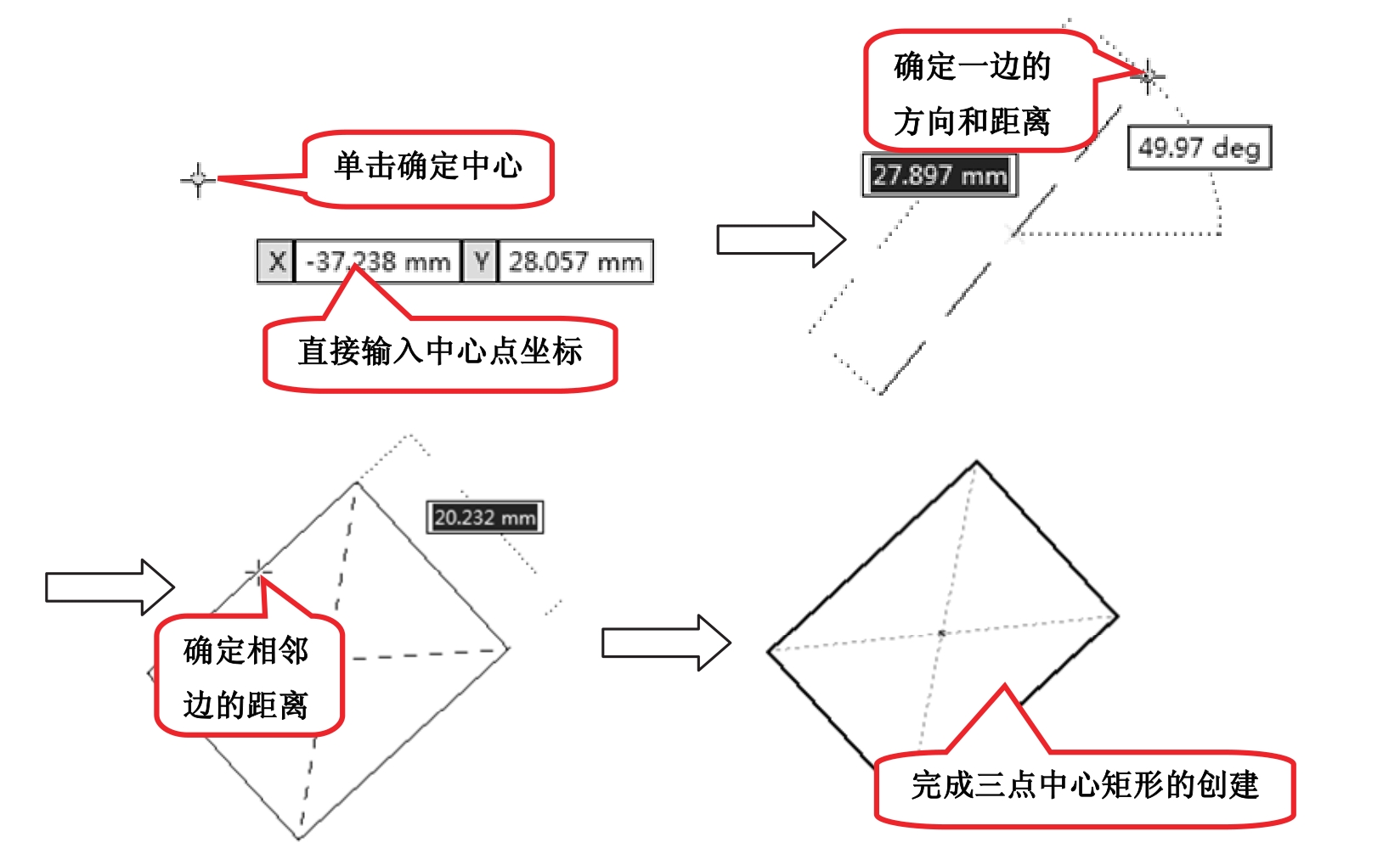 功能区:单击“草图”标签栏“绘制”面板上的“三点中心矩形”按钮