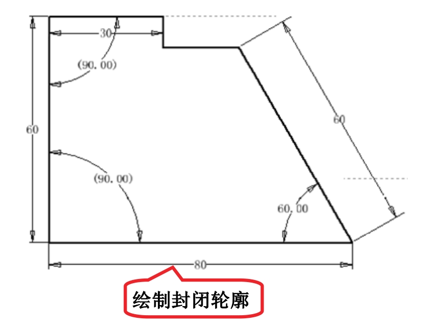 ,在视图中指定一点为起点,拖动鼠标输入长度为30,角度为180°,按“Tab”键切换输入,如图3-27所示。输入长度60,角度为90°,输入长度80,角度90°,输入长度60,角度为60°,捕捉第一条直线的起点延伸确定直线的长度,绘制封闭的图形,如图3-28所示。