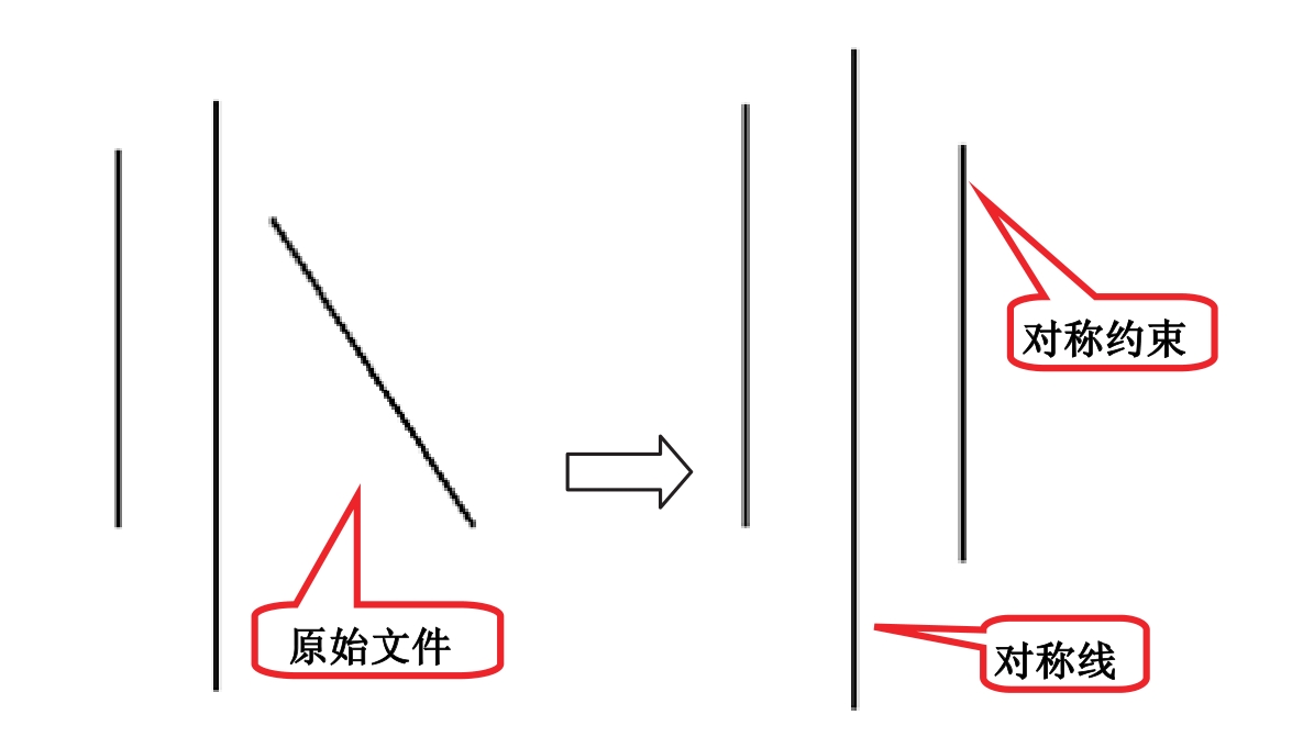 使所选直线、曲线或圆相对于所选直线对称。应用这种约束时,约束到所选几何图元的线段也会重新确定方向和大小。使用该约束工具时依次用鼠标选取两条直线、曲线或圆,然后选择它们的对称直线即可创建对称约束。注意,如果删除对称直线,将随之删除对称约束。