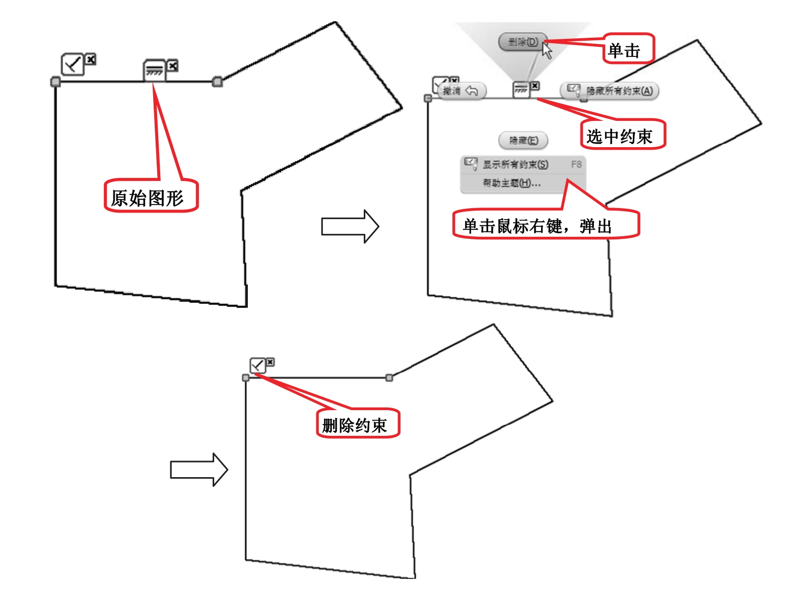 打开随书光盘“源文件”文件夹下“第3章\课上十分钟\删除约束”,操作过程如图3-76所示。